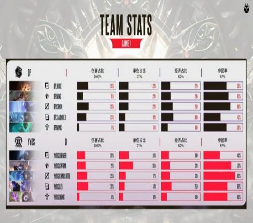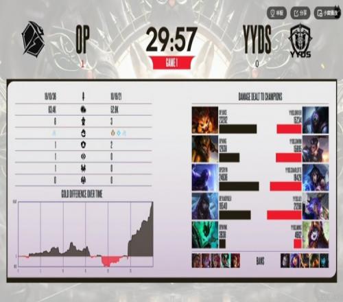首局比賽,Driver賈克斯對線期斷線被OP上野逮捕!隨后自己又被越塔一波!同時Ning皇子節奏不斷,OP連續兩次強殺Uzi蕓阿娜之后拿下主動權!中期兩隊你一波我一波,Driver賈克斯對位單殺之后也找回了場子,YYDS先拿三條小龍給足壓力!關鍵的龍魂團Juice大納爾一拍五幫助隊伍團滅對手拿下小龍+大龍!隨后的比賽裝備成型的xiaoyueji厄斐琉斯不留情面,直接大招炸死Uzi蕓阿娜,OP擊殺YYDS四人之后先拿一分!