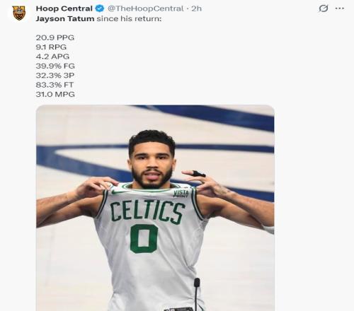 塔圖姆本賽季復出的11場比賽綠凱拿到9勝2負,塔圖姆場均31分鐘,拿到20.9分9.1籃板4.2助攻1.1搶斷0.2蓋帽,命中率39.9%,三分命中率32.3%,雖然效率還是不佳但數據已經恢復到接近20+10+5。