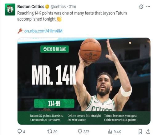 這場比賽是杰森-塔圖姆職業生涯14000分里程碑,但也不只是1.4萬分里程碑,凱爾特人官方曬出了塔圖姆與綠凱更多的紀錄。