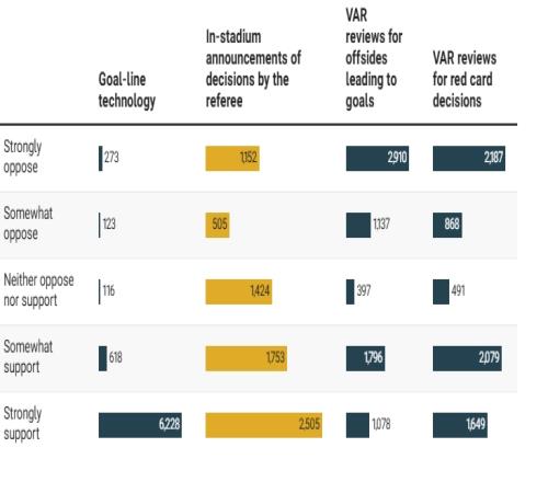 72%的受訪者反對對角球進行 VAR 審查,52%的受訪者反對對第二張黃牌進行 VAR 檢查,這兩項都將在今年夏天的世界杯上首次生效。