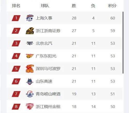 CBA常規(guī)賽第32輪結(jié)束,目前上海隊(duì)以28勝4負(fù)的戰(zhàn)績排名榜首,浙江廣廈隊(duì)以27勝5負(fù)的戰(zhàn)績排名第二;北京首鋼隊(duì)、廣東隊(duì)、深圳隊(duì)和山東高速的戰(zhàn)績都是21勝11負(fù),因?yàn)橄嗷ラg勝場的關(guān)系分別排名第3至第6名。此前上海隊(duì)和浙江廣廈隊(duì)已經(jīng)提前鎖定了季后賽的名額,并且本賽季大概率是排名前二的球隊(duì),常規(guī)賽前四的另外兩支球隊(duì)大概率從首鋼、廣東、深圳和山東高速之間產(chǎn)生。