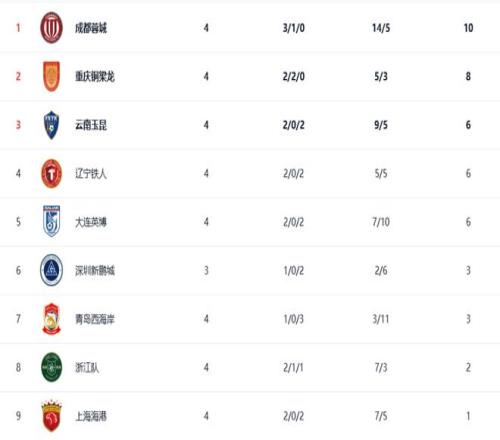 前4輪之后,成都蓉城以10分排名榜首,重慶銅梁龍以8分排名第2位,云南玉昆、遼寧鐵人、大連英博分別以6分排名其后。