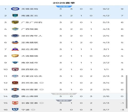 斬獲賽季首勝的陜西聯合與石家莊功夫同積3分,并憑借著凈勝球優勢排在第10。值得一提的是,陜西聯合目前還少賽一輪,他們與大連鯤城的比賽被推遲。