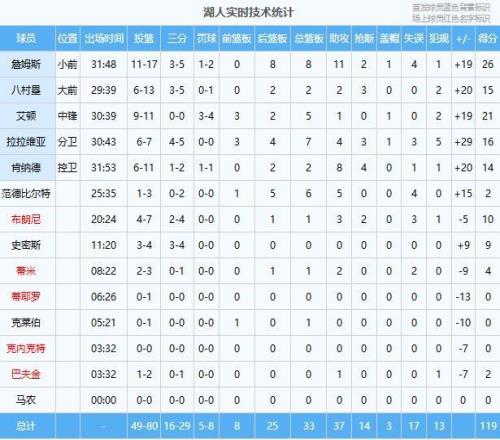 下半場勇士松松垮垮,湖人抓住機會14-5攻擊波拉開比分,波杰姆斯基里突外投連續(xù)止血,艾頓接連打成半節(jié)10分,布朗尼三分命中后勇士連追6分,三節(jié)還落后9分,末節(jié)詹姆斯攻傳帶隊13-2攻擊波一舉拉開20分以上領先,克賴爾受傷,隨后湖人牢牢保持住20分以上領先,最終湖人119-103輕取勇士重回西部第四。