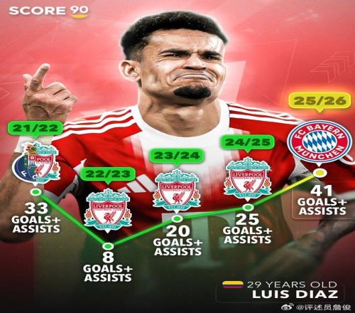 詹俊:迪亞斯這個賽季以近6500萬鎊轉會費加盟拜仁后表現一直很出色,到目前為止給球隊送上23球+18個助攻,這個數據創下個人職業生涯新高。美加墨世界杯也期待他帶領哥倫比亞國家隊沖擊小組第二的位置(與葡萄牙、民主剛果和烏茲別克同組)。