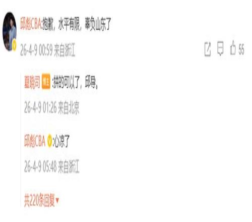 山東隊(duì)現(xiàn)在有點(diǎn)要崩的意思,克里斯手指骨折長(zhǎng)期缺席,新來(lái)的外援沒(méi)能打出身價(jià),球隊(duì)近期戰(zhàn)績(jī)也是起伏很大,和強(qiáng)隊(duì)的比賽只贏了廣東一場(chǎng),其余全輸,期間還慘敗寧波30分,上一輪輸給廣廈后,邱彪是一夜未眠,凌晨時(shí)分現(xiàn)身社媒回復(fù)媒體人喊話山東球迷:抱歉,水平有限,辜負(fù)山東了,心涼了。