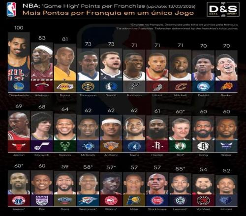 NBA各隊單場得分紀錄!好多隊比想象中低好多,好多... 左右為籃 2026-04-11 21:42:38 NBA各隊歷史單場得分紀錄大排行,張伯倫100分高居榜首,阿德巴約、科比緊跟其后。90分檔沒有一人,80分檔有兩人,70分檔有7人,70分已經排到了第九、十名。 在大家看來,哪支球隊的最高分相對之下,含金量沒那么高? 科比免費觀看_NBA免費觀看_含金量免費觀看_科比高清在線_NBA高清在線_含金量高清在線 科比 NBA 含金量 總冠軍 阿德巴約 威爾特·張伯倫 上一篇: MVP級數據!詹姆斯過去三場比賽場均28分7.7籃板12.7助攻! 下一篇: 勇士118124國王!科爾談附加賽充滿信心,庫里賽后也帶好消息