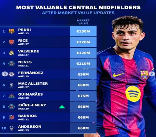 德轉列中前衛身價榜:佩德里、賴斯、巴爾韋德、內維斯均破億