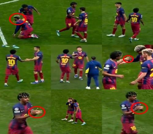 阿勞霍跪在地上,亞馬爾與烏拉圭中衛擊掌,并將他拉起來;加維、巴德吉、萊萬看上去心情不佳,亞馬爾上前,與他們一一擊掌,送上鼓勵;對于來到大都會球場的巴薩球迷,亞馬爾鼓掌表達感謝。