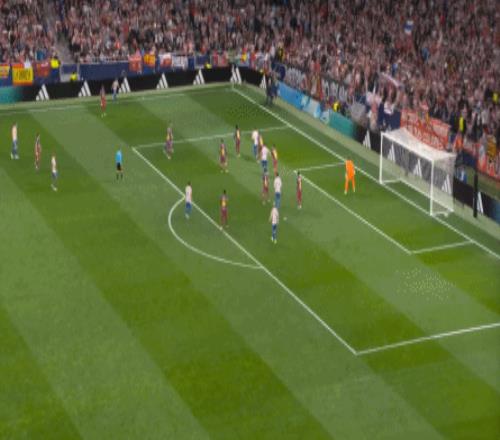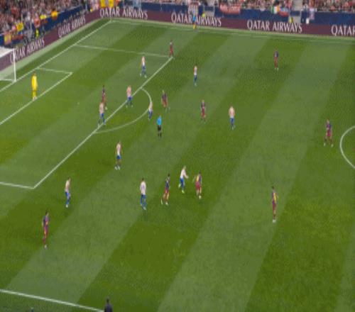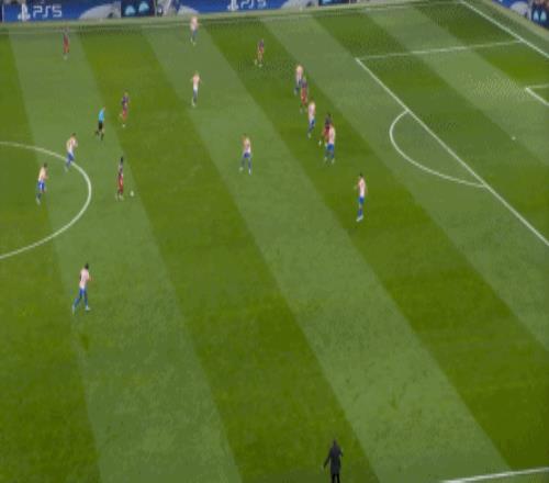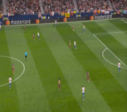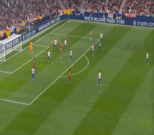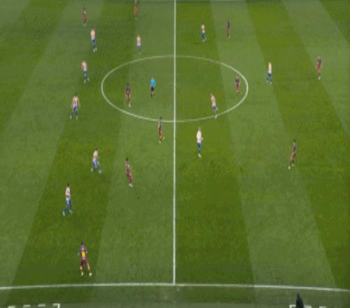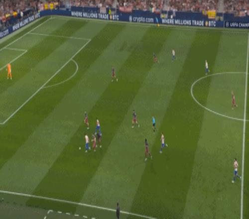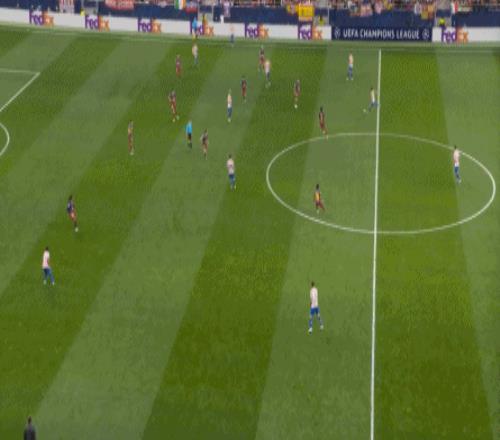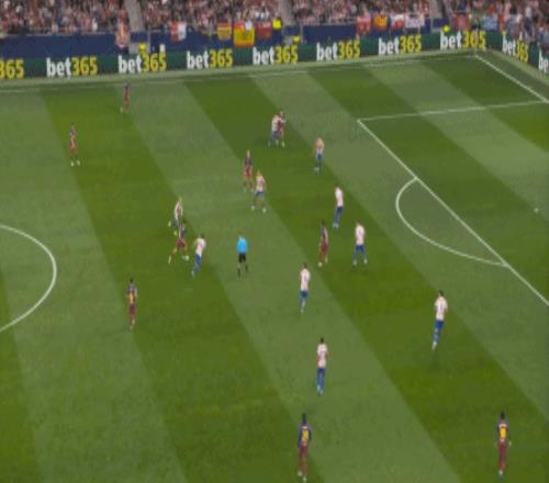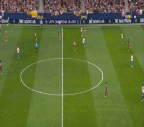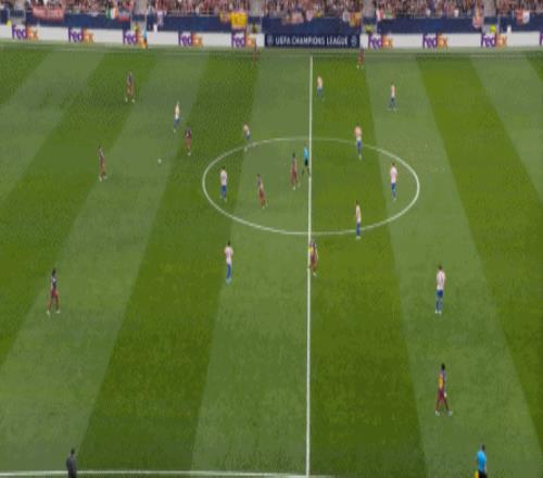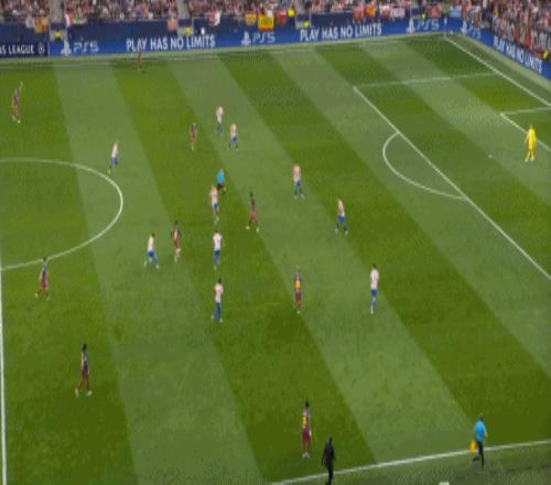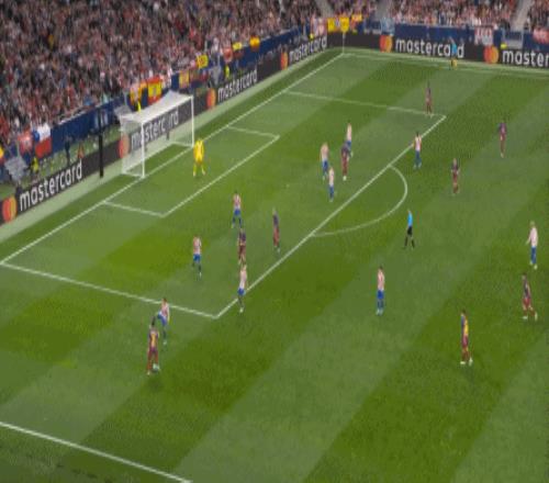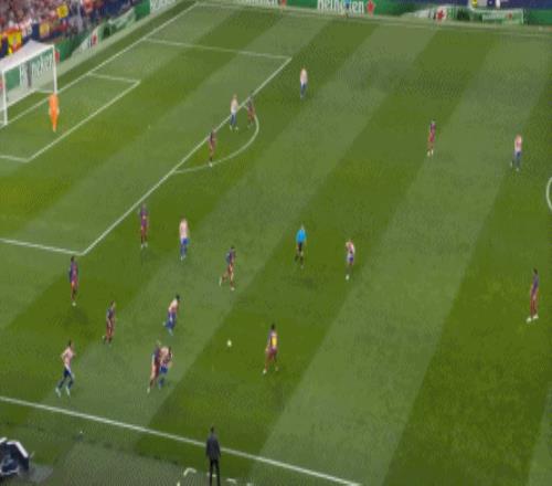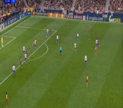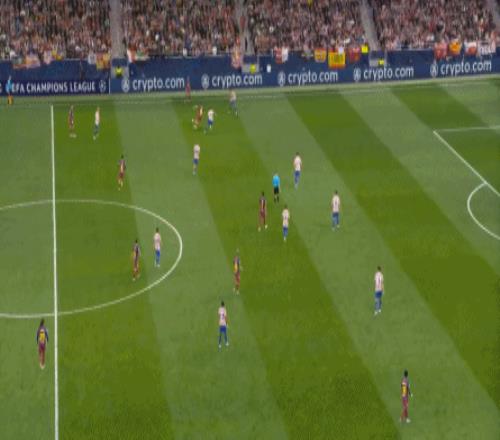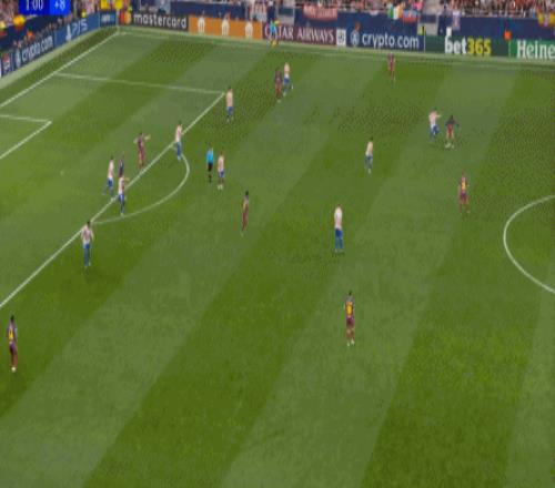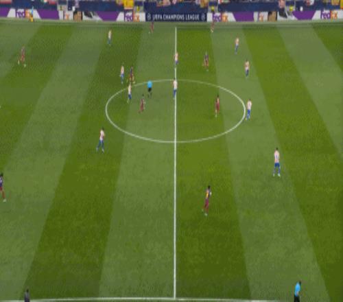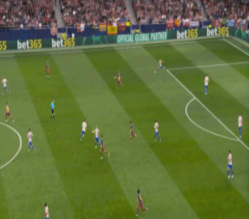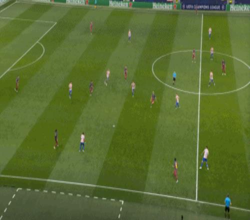 西蒙尼的球隊依然精準地捕獲了巴薩的高位防線的身后空間,而且在前場還獲得了清晰的拼腳優勢,這讓他們一直領先半個身位的優勢。