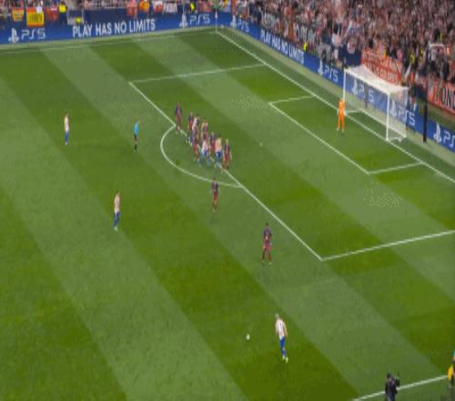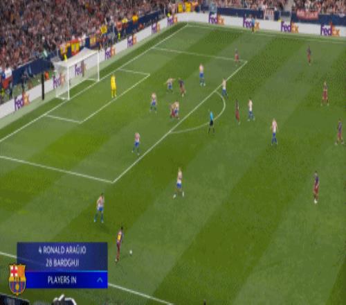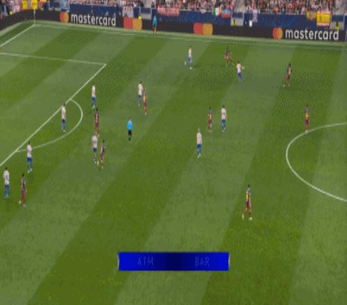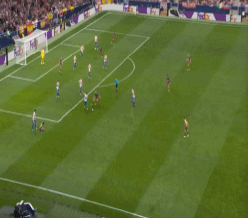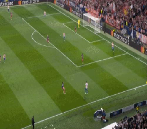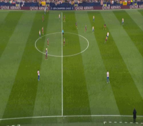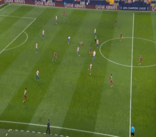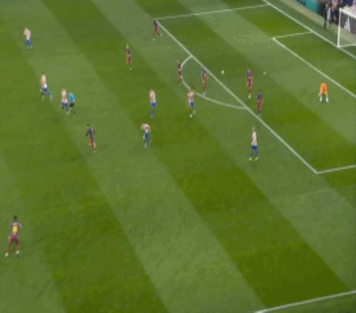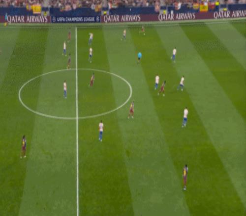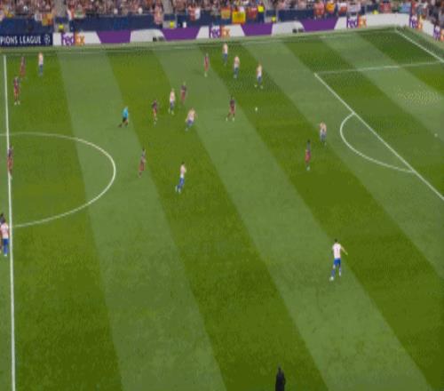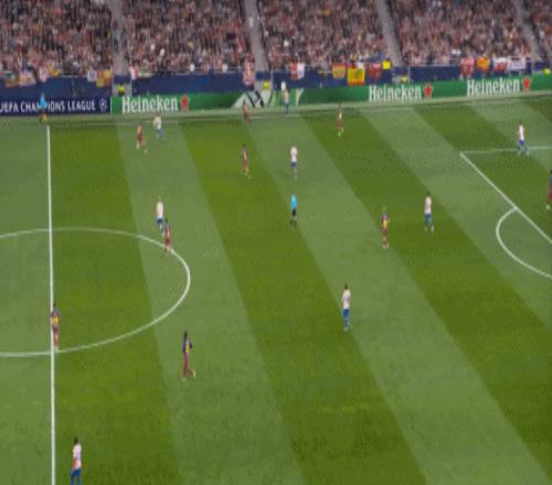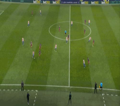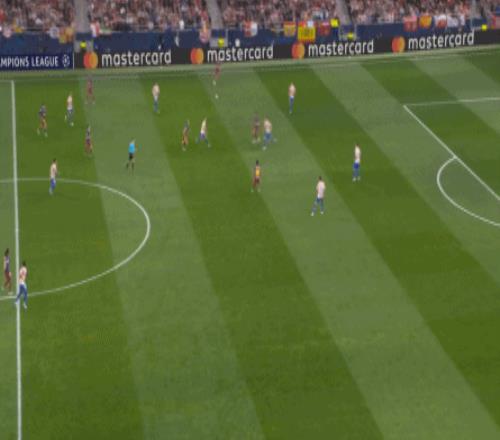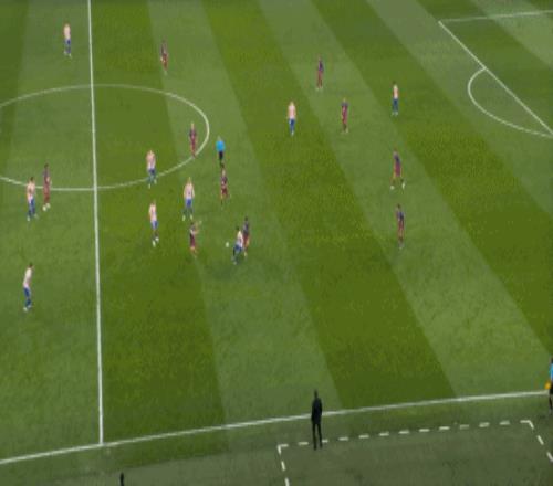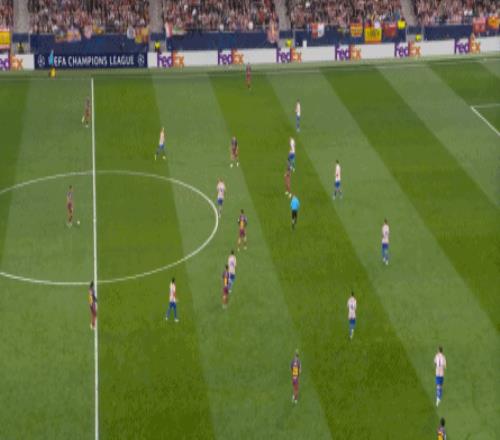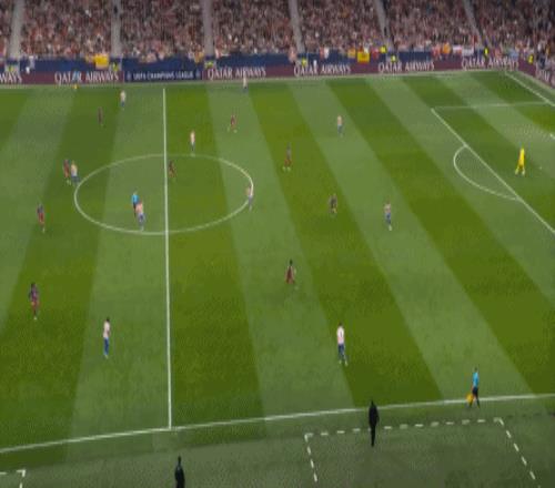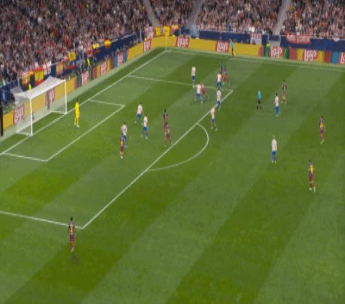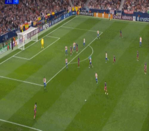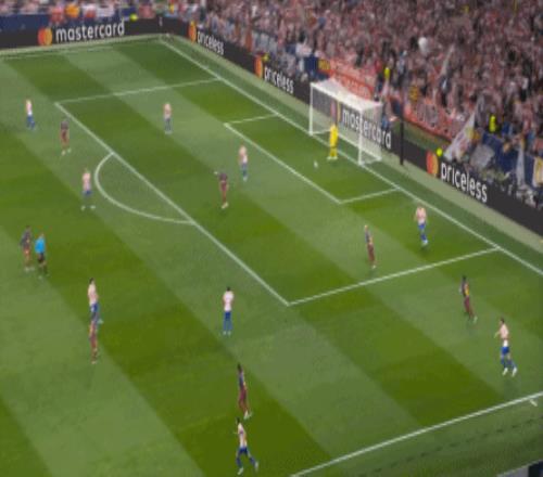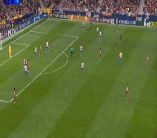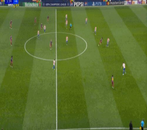 西蒙尼的球隊依然精準地捕獲了巴薩的高位防線的身后空間,而且在前場還獲得了清晰的拼腳優勢,這讓他們一直領先半個身位的優勢。