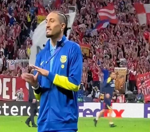 比賽結(jié)束后,拉菲尼亞走向看臺(tái)向巴薩球迷致意。當(dāng)他遭到附近一群馬競(jìng)球迷的嘲諷和噓聲時(shí),這位巴西前鋒做出了一個(gè)帶有深意微笑的手勢(shì)。