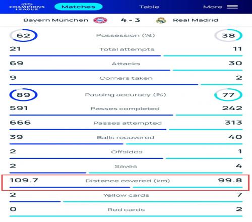 歐足聯官網數據統計顯示,拜仁全隊跑動109.7km,皇馬全隊跑動99.8km,皇馬比拜仁少跑近10km。