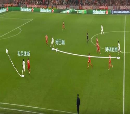 拜仁整體隊形太高,縱深空間留的很大。姆巴佩突然轉型獵豹,利用自己的沖刺,接應到了韋尼休斯的妙傳,讓皇馬取得半場3比2的領先,追平了兩回合總比分。