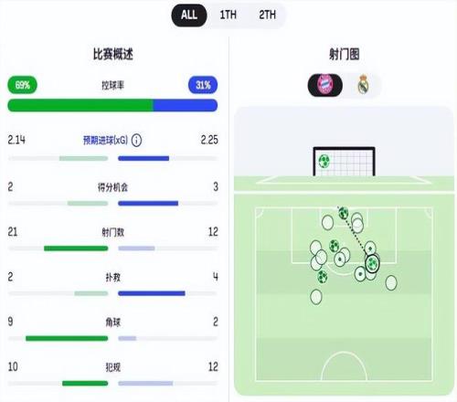 本場比賽雖然射門數是拜仁領先,不過絕佳機會上皇馬占優,預期進球同樣是皇馬更多。考慮到拜仁的預期進球有一部分是靠射門總數堆出來的,皇馬的進攻質量顯然更高。