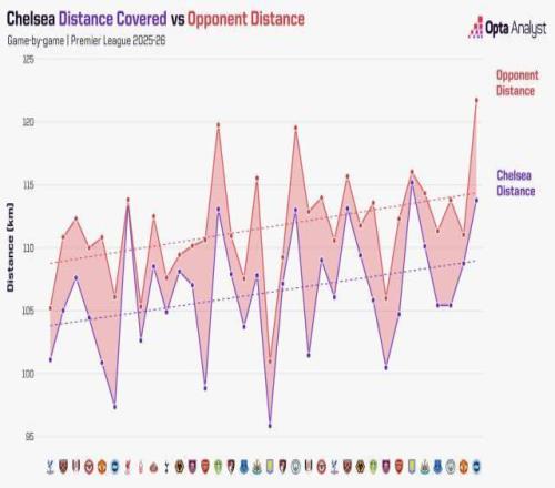 Opta統計數據顯示,切爾西是本賽季英超迄今所有比賽總體跑動距離場場都比對手少的。如此,主教練的戰術何以得到實行。