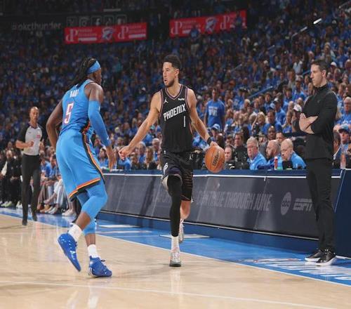 布克的問題更微妙。23分的數據不差,但他在場時太陽的進攻并沒有"活"起來。17次出手,很多是強解——不是機會出來了,是時間快到了。這種打法在常規賽可以靠個人能力兜底,季后賽面對雷霆的協防體系,效率斷崖式下跌。