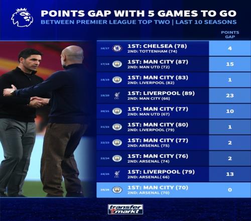 體育播報4月23日宣 德國轉會市場盤點了英超近10個賽季還剩最后5輪比賽時的前兩名球隊分差,本賽季0分最少。