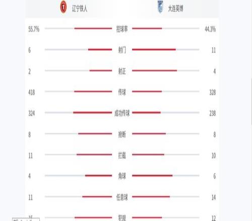 本場數據方面,英博與鐵人的控球率是44.3%-55.7%、射門數是11-6、角球數是6-4、傳球數是328-418。從數據上看,顯然大連英博比賽中的狀態、戰術執行力更好,贏球實至名歸。