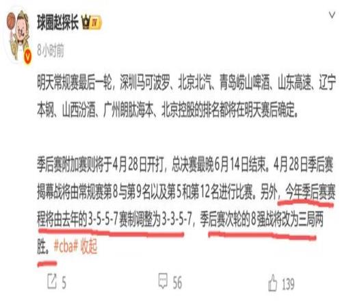 據(jù)媒體人球圈趙探長(zhǎng)透露,CBA季后賽附加賽將于4月28日開(kāi)打,總決賽最晚6月14日結(jié)束,另外今年季后賽賽程由去年的3-5-5-7調(diào)整為3-3-5-7。也就是說(shuō)季后賽次輪由去年的5局3勝,改為3局2勝。這也引起了球迷的熱議:“無(wú)聊的常規(guī)賽打這么多輪,季后賽反而縮水”、“草臺(tái)班子,沒(méi)有規(guī)律性,想改就改。”