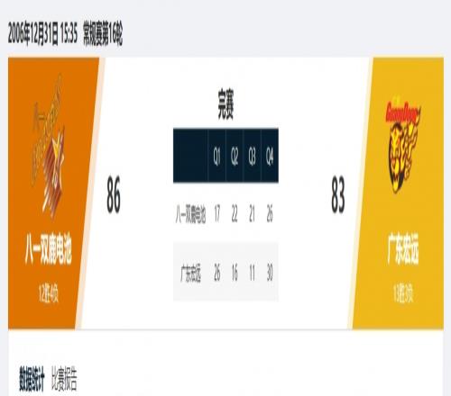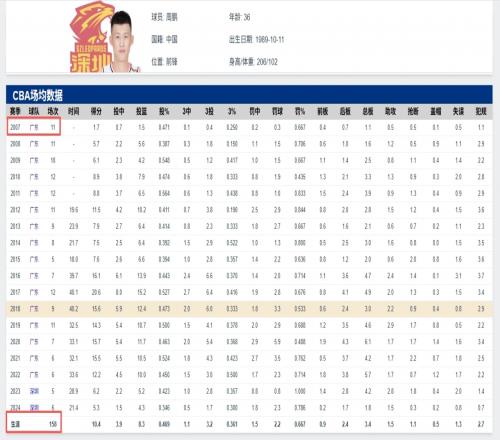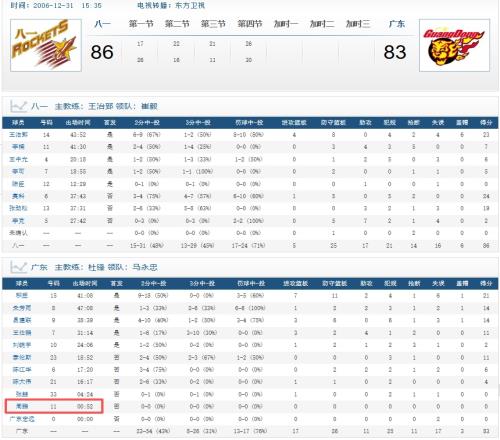 其中,2006年12月31日,CBA常規賽第16輪,廣東客場對陣八一,是役周鵬出戰了52秒,但是CBA官網并沒有將這場比賽計入周鵬當賽季的出場數統計中。