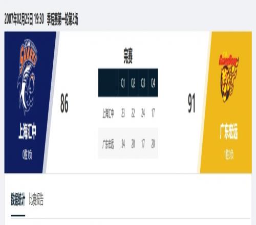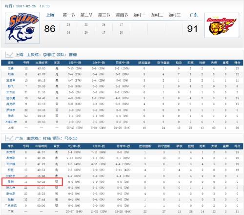 而在2007年2月25日,CBA季后賽首輪G2,廣東客場對戰上海,是役周鵬登場38秒,但是CBA官網同樣沒有將這場比賽計入周鵬當賽季的出場數統計中。