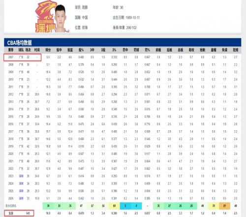 經過對周鵬每個賽季出場數進行對比發現,問題就出在2006-07賽季上,CBA官網關于那個賽季的出場時間統計有缺失的情況。