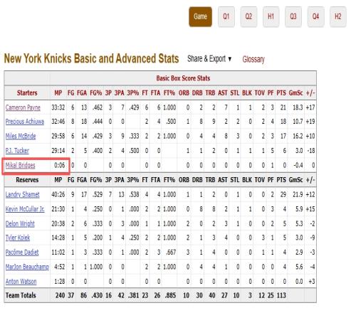 在NBA賽場也有活生生的例子,尼克斯側翼米卡爾·布里奇斯(大橋)在去年常規賽收官戰僅出場6秒就下場,今年常規賽收官戰則是登場23秒,那么聯盟會不計算他這兩場比賽的出場數嗎?顯然不會!大橋從進入NBA聯盟以來每個賽季都是全勤。
