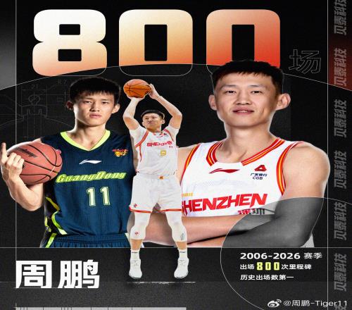CBA常規賽第39輪,深圳在客場以104-96戰勝新疆。此役,深圳男籃老將周鵬出場22分28秒7投4中,三分6中3,得到11分2籃板1搶斷1蓋帽。更為重要的是,周鵬迎來了CBA生涯“800場”里程碑,球員本人也在社媒發布并轉發了海報等相關內容。