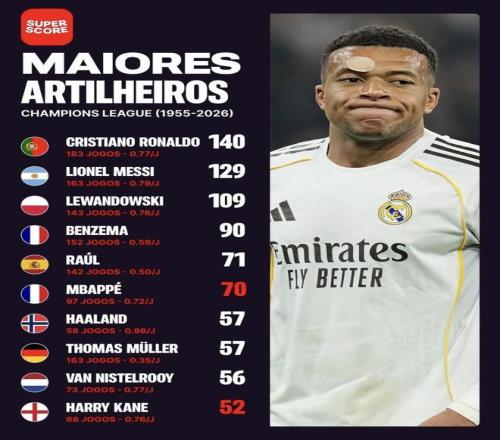 但想沖擊前二,尤其是C羅,那是真難。梅西129球,C羅140球,差距分別是59球和70球。這種量級的差距,根本不是靠一兩個高產賽季就能填平的,這要求他連續很多年都必須保持在頂級水平。歐足聯歷年數據里,C羅拿過單賽季17球、16球、15球的數據,梅西也有多次12到14球的高產年。姆巴佩本賽季進15球,說明他具備這種單賽季沖高的能力,但要把“具備能力”變成“好多年一直保持”,中間還得抗住傷病、球隊戰績起伏、狀態下滑這些現實因素。新賽制能幫他拉近距離,但抹平不了這道門檻。