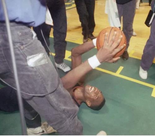 1997-98賽季季后賽,范甘迪抱莫寧大腿被拖行數米