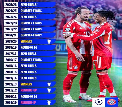 體育播報(bào)4月28日宣 歐冠官方曬海報(bào),列出拜仁慕尼黑近年的歐冠淘汰賽戰(zhàn)績(jī),具體如下: