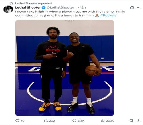 北京時間4月28日,全美著名的投籃訓練師Lethal Shooter官方公布了他為塔里-伊森進行了投籃特訓,伊森在最近的兩天里除了日常訓練外還專門來拜師苦練外線投射。(綠凱核心杰倫-布朗也曾拜師Lethal Shooter)